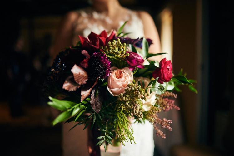 Florals featured Scabiosas, Roses, Anemones, Ranunculus, Garden Roses, Lisianthus, Chrysanthemums, Cymbidium Orchids, Hydrangeas, Berries, a mix of Ferns and Ruscus.