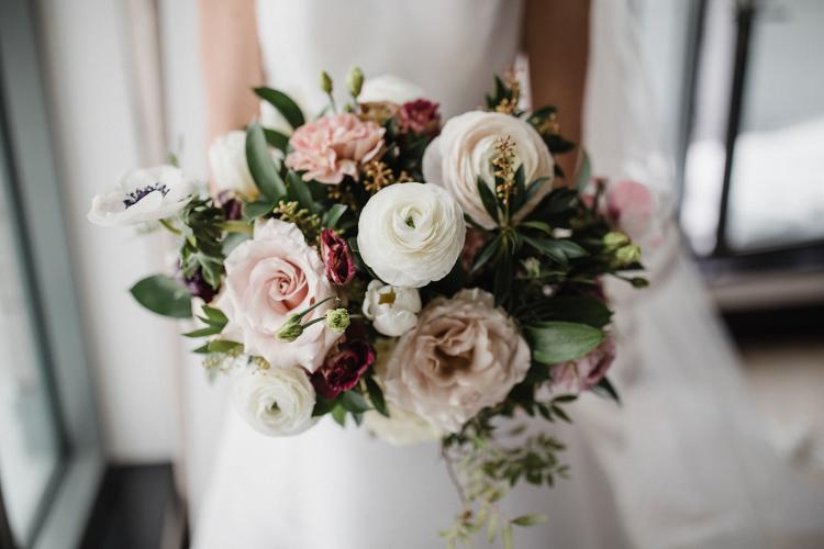 For their wedding flowers, this couple had chosen to go with our ''À la Carte'' option, perfect for their intimate nuptials! We simply created a bridal bouquet and 5 assorted boutonnieres for the groom and groomsmen. Side note, this couple was probably the most relaxed clients we have ever seen: on the morning of their wedding, they both arrived at the studio by jogging and left together, flowers in hand, with an Uber to go get ready. Super chill, right?