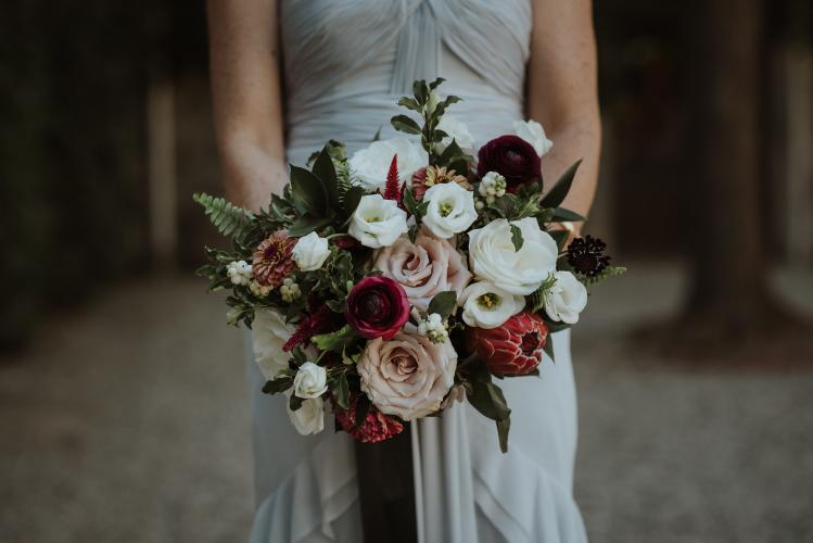 Florals were designed in a boho style with an emphasis on textures and lots of spilling foliage. Bloom selection included Zinnias, Callas, Protéas, Blushing Brides, Garden Roses, Dahlias, Cymbidium Orchids, Viburnum berries, Carnations, a mix of Eucalyptus and Ruscus.