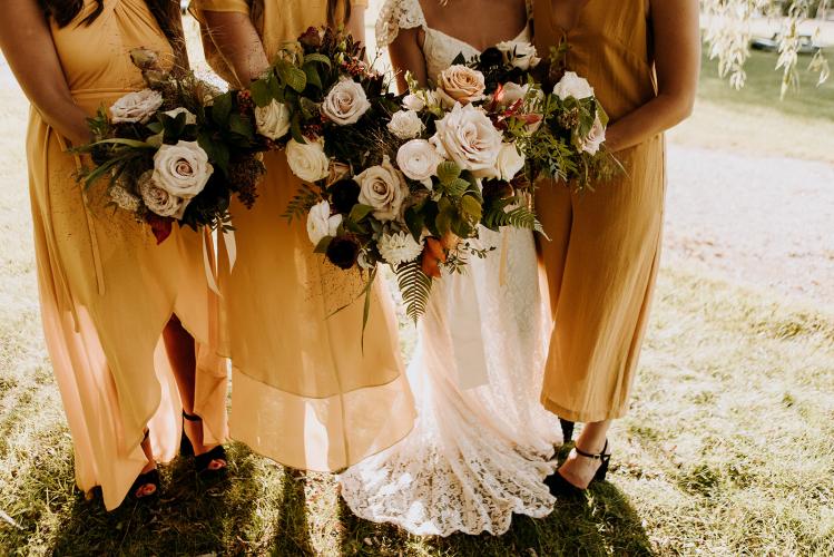 For this beautiful small wedding, we simply created the bridal bouquet, the bridesmaid's bouquets and bridal party's boutonnieres. A moody and neutral color palette of ivory, blush, brown, nude with hints of black and plum. Featured blooms included Ranunculus, Roses, Scabiosa, Lisianthus, Spray roses, Ammi Dara, Ninebark, Ruscus and Raspberry foliage. The bridal bouquet was completed with a taupe satin ribbon detail.