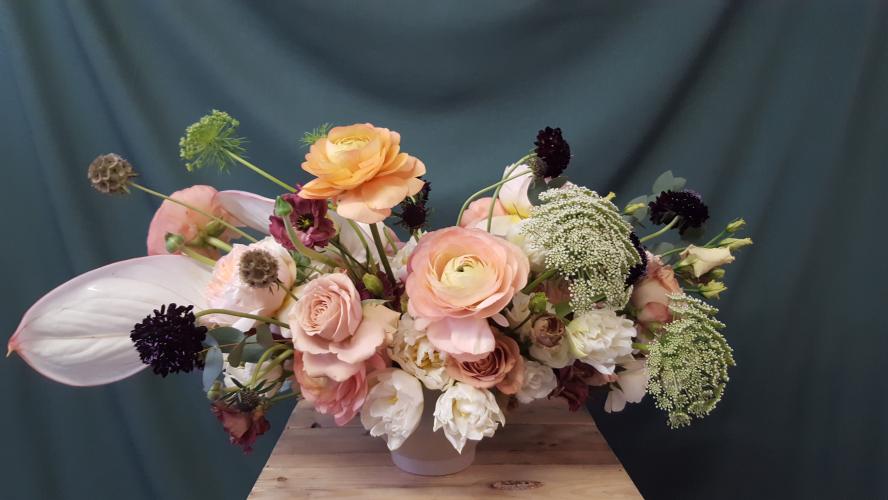 Florals were styled in a loose style with an emphasis on textures. The selection featured Ranunculus, Scabiosas, Roses, Cotton, Lisianthus and a mix of Ruscus, Eucalyptus and touches of Evergreens