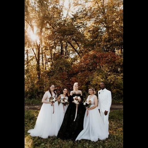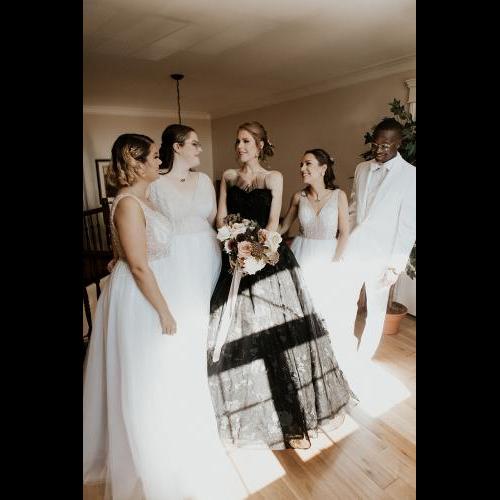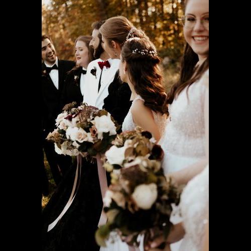 For this beautiful small wedding, we simply created the bridal bouquet, the bridesmaid's bouquets and bridal party's boutonnieres. A moody and neutral color palette of ivory, blush, brown, nude with hints of black and plum. Featured blooms included Ranunculus, Roses, Scabiosa, Lisianthus, Spray roses, Ammi Dara, Ninebark, Ruscus and Raspberry foliage. The bridal bouquet was completed with a taupe satin ribbon detail.