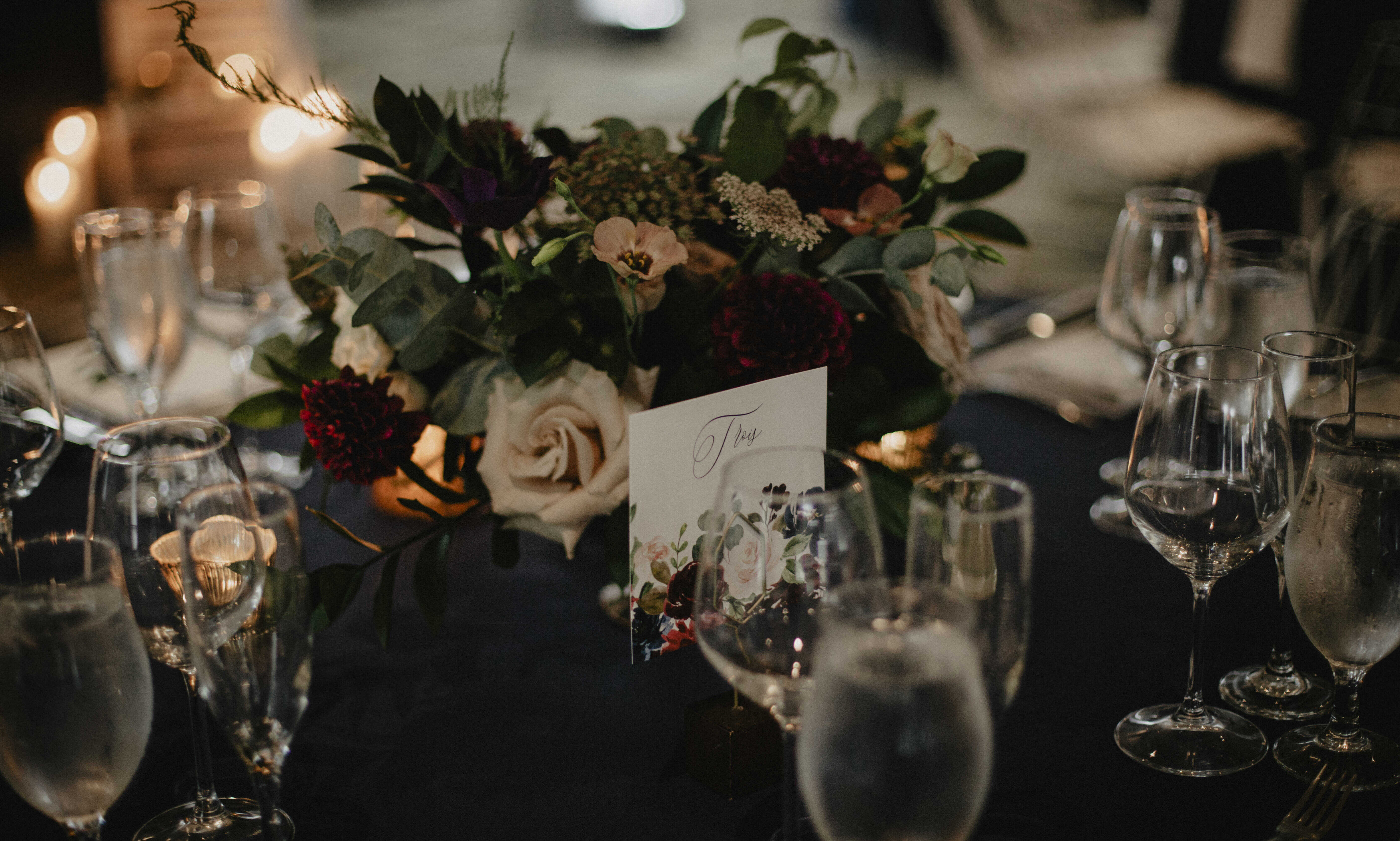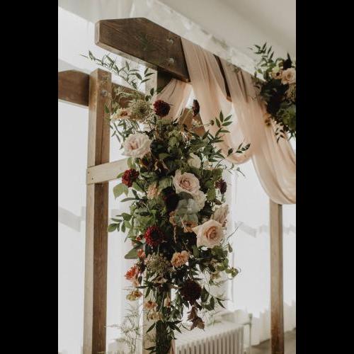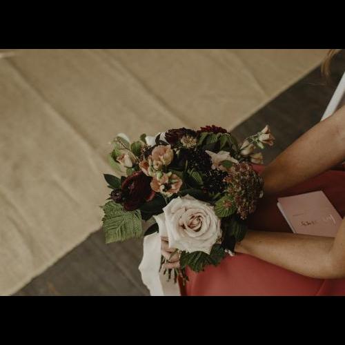 Pour la sélection de fleurs, nous avons choisi d'y aller avec plusieurs fleurs saisonnières et locales dont des Zinnias, Lisianthus, Ammi Dara, Dahlias et Framboisier, mixtés avec des Roses, Oeillets Antiques, Rosettes et compagnie.